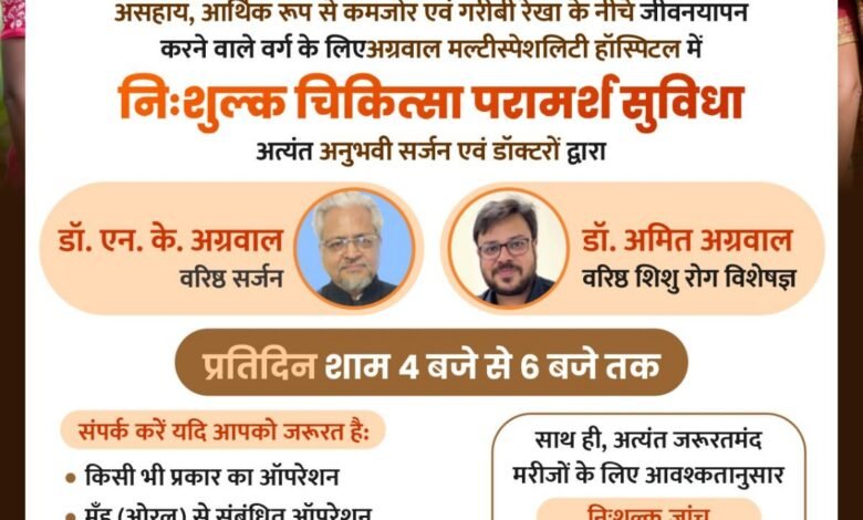 अग्रवाल मल्टीस्पेशलिटी हॉस्पिटल में प्रतिदिन नि: शुल्क चिकित्सा परामर्श शाम 4 बजे से 6 बजे तक
