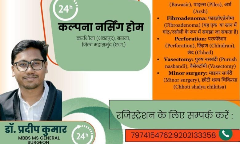 कल्पना नर्सिंग होम कर्राभौना/भंवरपुर : डॉ प्रदीप कुमार “MBBS MS जनरल सर्जन” प्रतिदिन उपलब्ध हैं, हर्निया, पिस्टुला, भगन्दर, पाइल्स सहिंत सभी प्रकार के उपचार के लिए अभी संपर्क करें