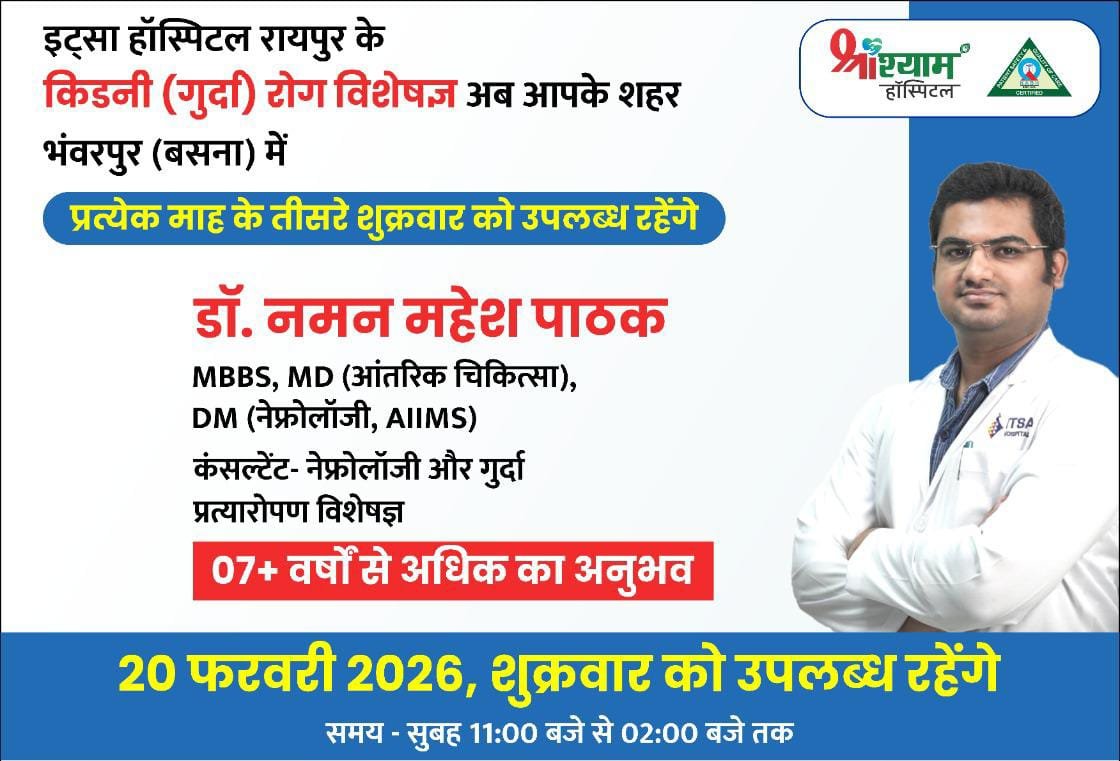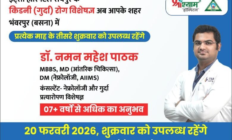 श्री श्याम हॉस्पिटल भंवरपुर में स्वास्थ्य सेवा का विस्तार: प्रसिद्ध किडनी रोग विशेषज्ञ डॉ. नमन महेश पाठक 20 फरवरी को उपलब्ध