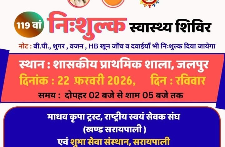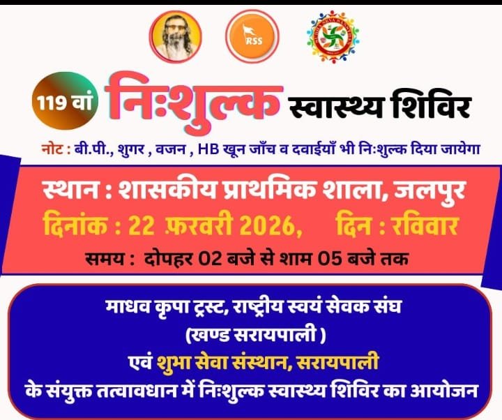 Home/सरायपाली/सरायपाली: जलपुर में 22 को नि: शुल्क स्वास्थ्य शिविर का आयोजन सरायपाली सरायपाली: जलपुर में 22 को नि: शुल्क स्वास्थ्य शिविर का आयोजन काका खबरीलालFebruary 19, 2026 2,102 Less than a minute Related Articles सरायपाली: शिक्षक के जन्मदिन के अवसर पर न्योता भोज का आयोजन February 19, 2026 AD#1 Tagsसरायपाली: जलपुर में 22 को नि: शुल्क स्वास्थ्य शिविर का आयोजन काका खबरीलालFebruary 19, 2026 2,102 Less than a minute Facebook Twitter WhatsApp Telegram Print