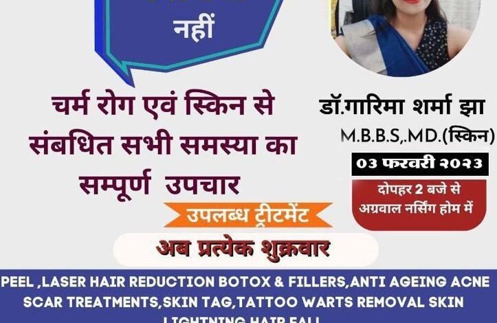 अग्रवाल नर्सिंग होम बसना में 3 फरवरी को उपलब्ध रहेंगे चर्म रोग विशेषज्ञ डॉ.गारिमा शर्मा झा