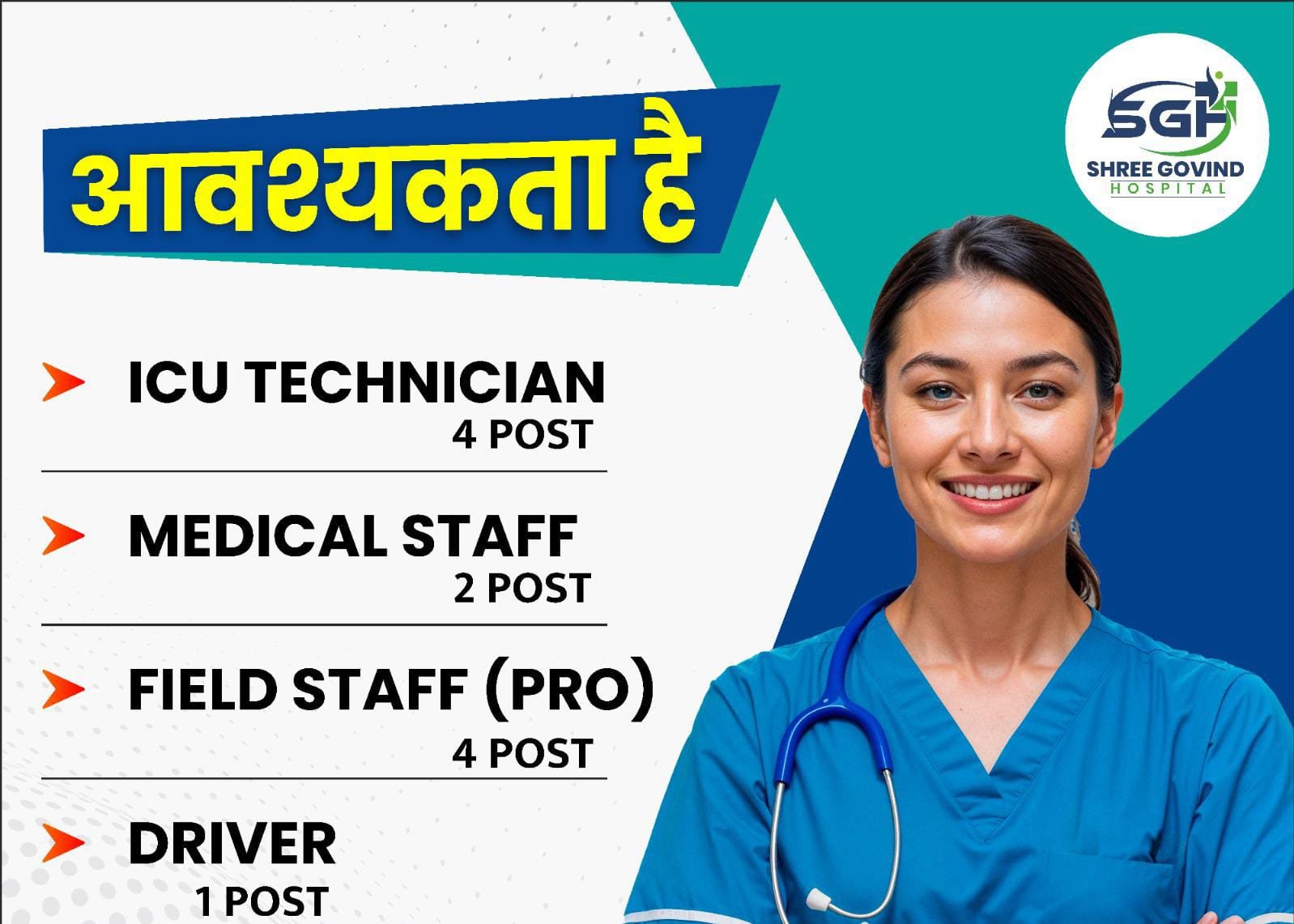 बसना। स्वास्थ्य सेवाओं के क्षेत्र में करियर बनाने की इच्छा रखने वाले युवाओं के लिए अच्छी खबर है। बसना स्थित श्री गोविंद हॉस्पिटल ने अपने संस्थान के विस्तार हेतु विभिन्न पदों पर भर्ती के लिए विज्ञापन जारी किया है।