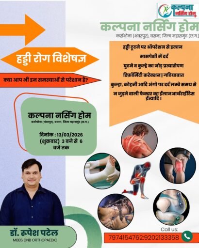 बसना (महासमुंद): क्षेत्र के निवासियों के लिए स्वास्थ्य के क्षेत्र में एक राहत भरी खबर है। कर्राभौना (भंवरपुर) स्थित कल्पना नर्सिंग होम में आगामी शुक्रवार को विख्यात हड्डी रोग विशेषज्ञ डॉ. रूपेश पटेल (MBBS, DNB ORTHOPAEDIC) अपनी विशेष सेवाएँ देने पहुँच रहे हैं।