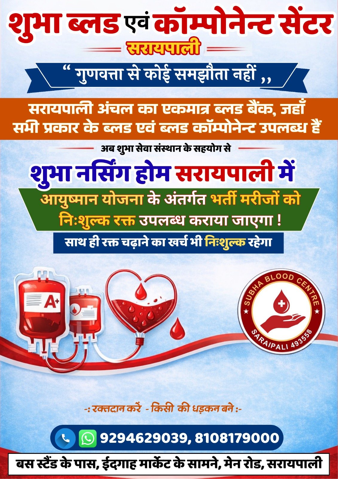 Home/सरायपाली/शुभा ब्लड एवं कॉम्पोनेन्ट सेंटर: अंचल का एकमात्र ब्लड बैंक जहां सभी प्रकार के ब्लड एवं ब्लड काॅम्पोनेंट उपलब्ध सरायपाली शुभा ब्लड एवं कॉम्पोनेन्ट सेंटर: अंचल का एकमात्र ब्लड बैंक जहां सभी प्रकार के ब्लड एवं ब्लड काॅम्पोनेंट उपलब्ध काका खबरीलालMarch 18, 2026 2,133 Less than a minute Related Articles सरायपाली:शिशु संरक्षण माह का किया गया शुभारंभ March 18, 2026 AD#1 Tagsशुभा ब्लड एवं कॉम्पोनेन्ट सेंटर: अंचल का एकमात्र ब्लड बैंक जहां सभी प्रकार के ब्लड एवं ब्लड काॅम्पोनेंट उपलब्ध काका खबरीलालMarch 18, 2026 2,133 Less than a minute Facebook Twitter WhatsApp Telegram Print