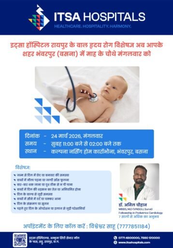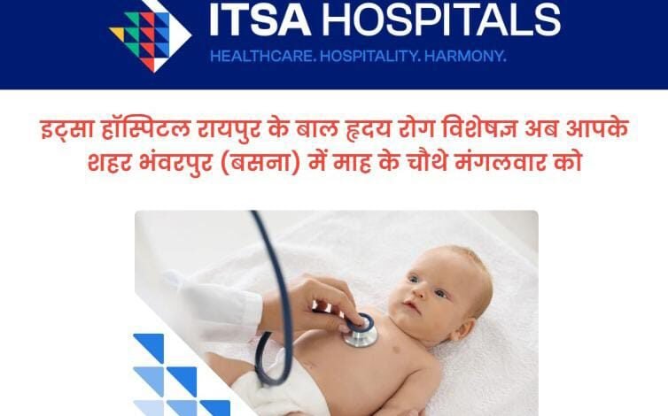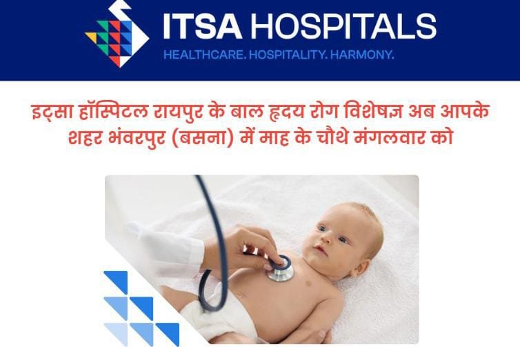 भंवरपुर/बसना: क्षेत्र के बच्चों में बढ़ती हृदय संबंधी समस्याओं को देखते हुए रायपुर के प्रतिष्ठित इत्सा हॉस्पिटल्स (ITSA Hospitals) द्वारा एक सराहनीय पहल की गई है। अस्पताल के विशेषज्ञ अब हर महीने के चौथे मंगलवार को भंवरपुर में अपनी सेवाएँ देंगे।