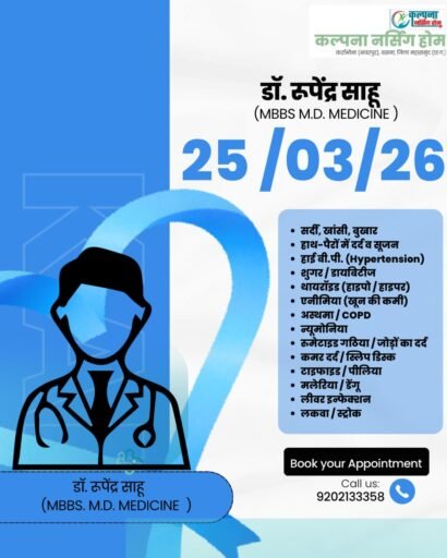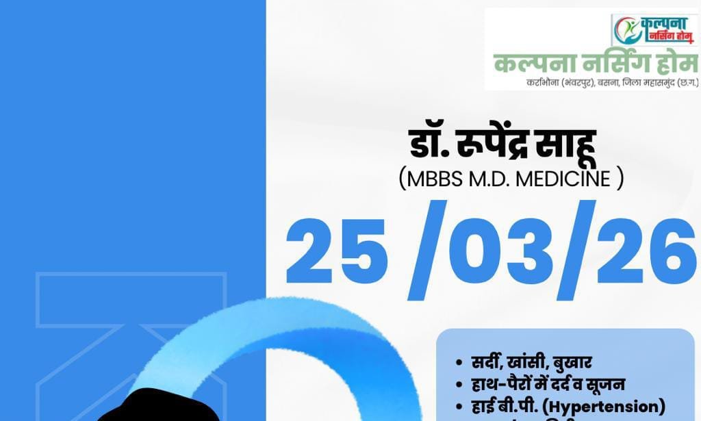 कर्राभौना/भंवरपुर महासमुंद। क्षेत्र के निवासियों के लिए बेहतर स्वास्थ्य सुविधाएं उपलब्ध कराने के उद्देश्य से, कल्पना नर्सिंग होम (कर्राभौना, बसना) में एक विशेष चिकित्सा शिविर का आयोजन किया जा रहा है। इस शिविर में प्रख्यात चिकित्सक डॉ. रूपेंद्र साहू (MBBS, M.D. MEDICINE) अपनी सेवाएं देंगे।