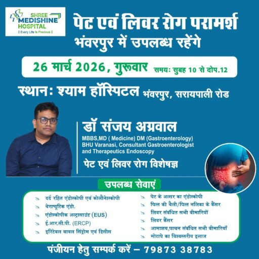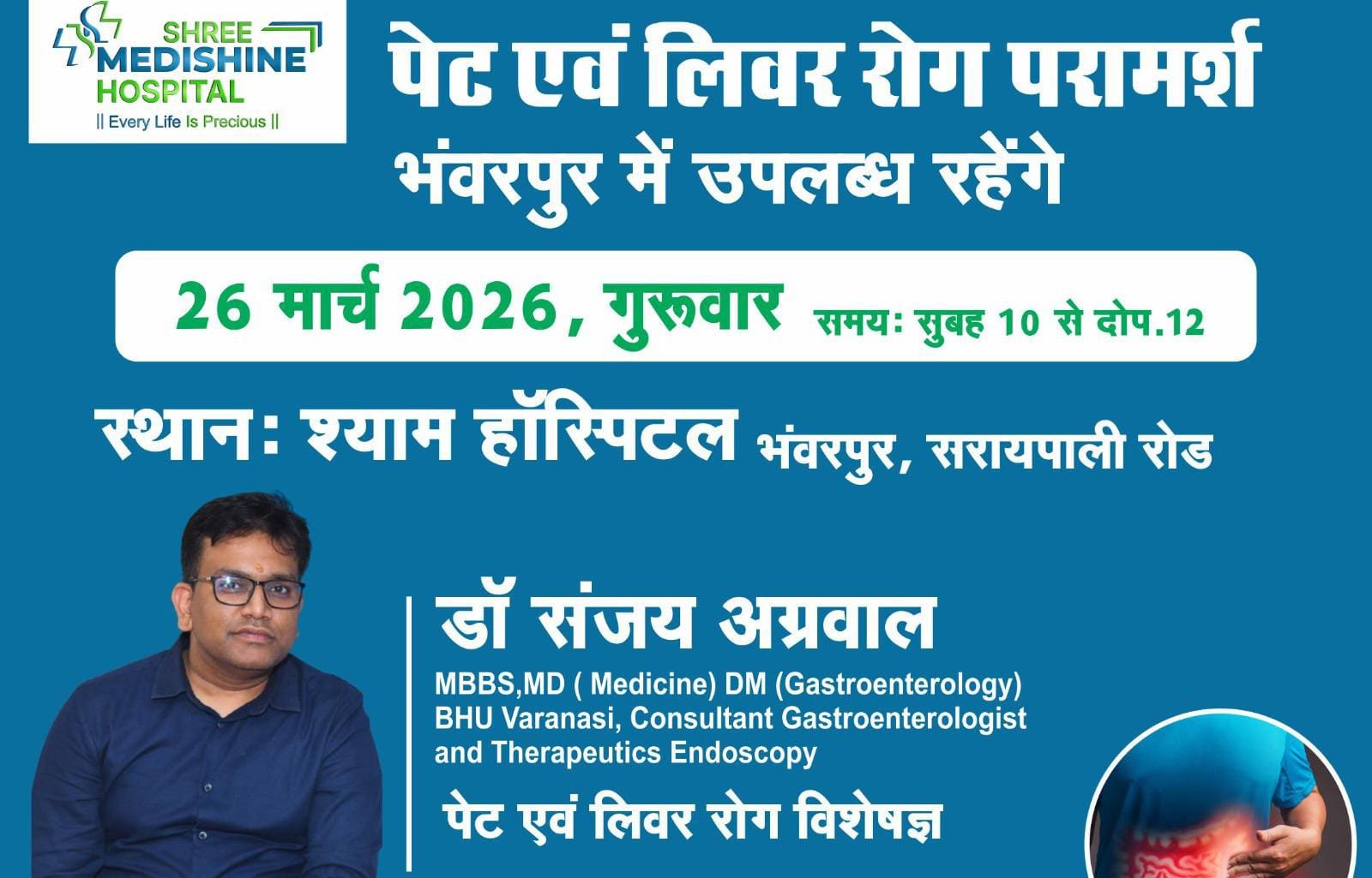 श्री श्याम हॉस्पिटल भंवरपुर में पेट एवं लिवर रोग शिविर कल: सुप्रसिद्ध गैस्ट्रोएंटेरोलॉजिस्ट विशेषज्ञ डॉ. संजय अग्रवाल देंगे परामर्श