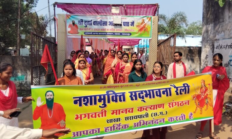 काकाखबरीलाल@सरायपाली। सरायपाली:भगवती मानव कल्याण संगठन की सरायपाली शाखा द्वारा क्षेत्र में सामाजिक जागरूकता लाने के उद्देश्य से एक विशाल ‘नशामुक्त सद्भावना जनजागरण रैली’ निकाली गई। यह आयोजन समाज को नशे की कुरीतियों से मुक्त करने और भाईचारे का संदेश देने के लिए किया गया।