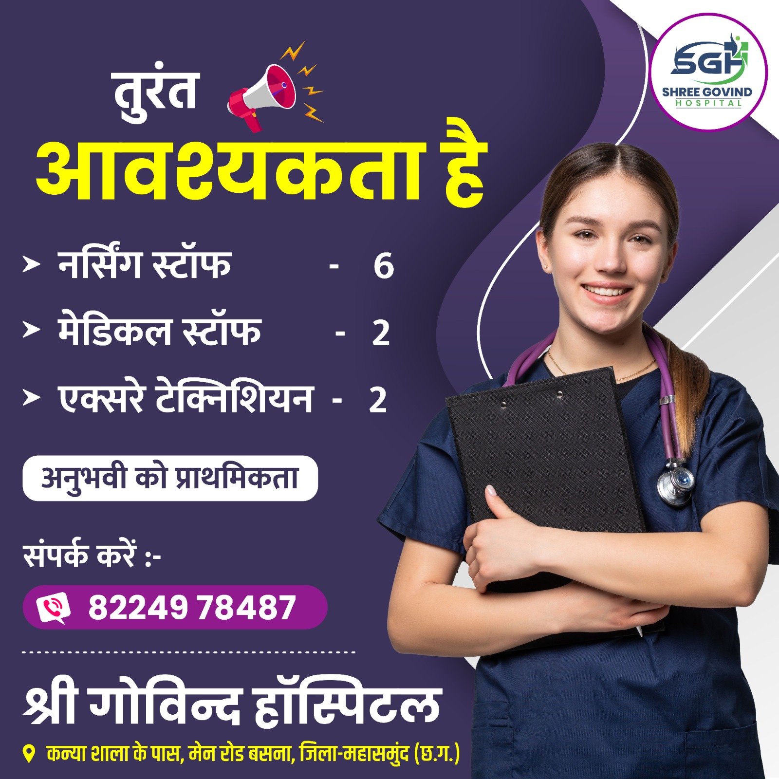 बसना: श्री गोविन्द हॉस्पिटल में नर्सिंग स्टॉफ, मेडिकल स्टॉफ सहिंत विभिन्न पदों पर निकली बंपर भर्ती, अनुभवी उम्मीदवारों को मिलेगी प्राथमिकता… अभी संपर्क करें…