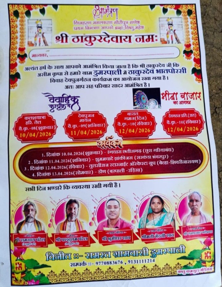 सरायपाली: डुमरपाली में 10 अप्रैल से ठाकुर देव विवाह का आयोजन