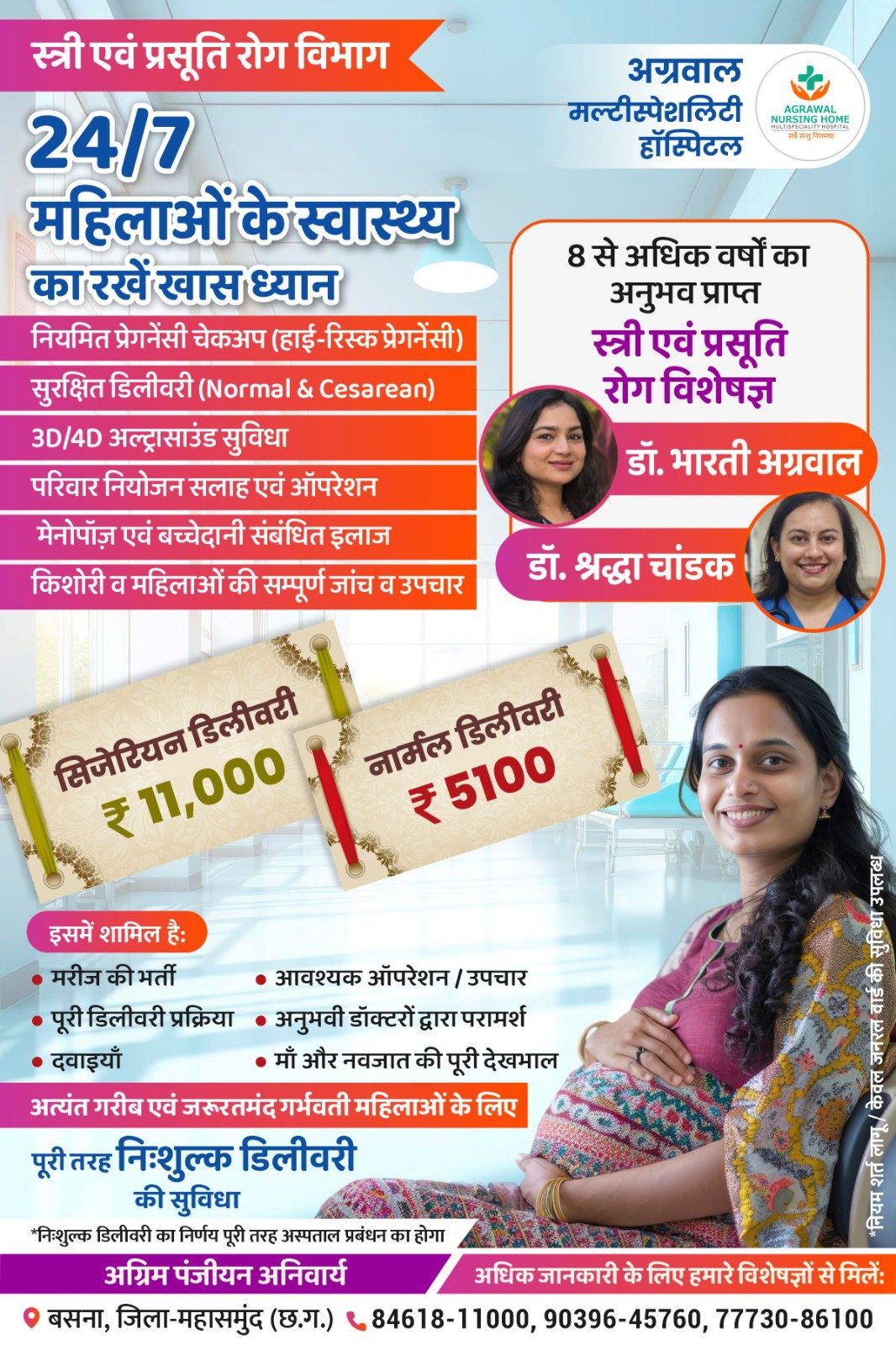 बसना:अग्रवाल मल्टीस्पेशलिटी हॉस्पिटल में अत्यंत गरीब व जरूरतमंद गर्भवती महिलाओं के लिए नि: शुल्क डिलिवरी सुविधा आज ही पंजीयन करें