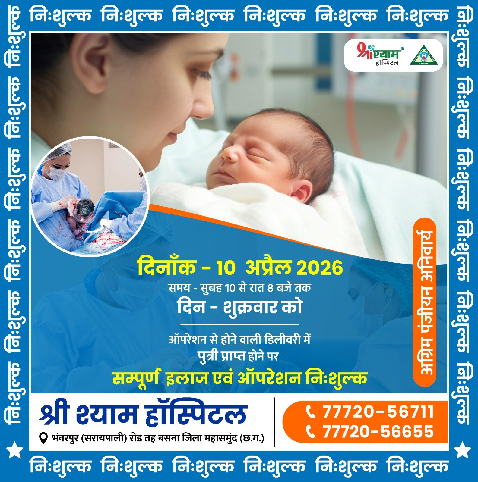 महासमुंद (छत्तीसगढ़): सामाजिक सरोकार और ‘बेटी बचाओ, बेटी पढ़ाओ’ के संकल्प को मजबूती देते हुए, जिले के बसना क्षेत्र स्थित श्री श्याम हॉस्पिटल भंवरपुर ने एक सराहनीय घोषणा की है। आगामी 10 अप्रैल 2026 को अस्पताल में एक विशेष शिविर का आयोजन किया जा रहा है, जिसमें बेटी के जन्म पर होने वाले प्रसव खर्च को पूरी तरह माफ करने का निर्णय लिया गया है।