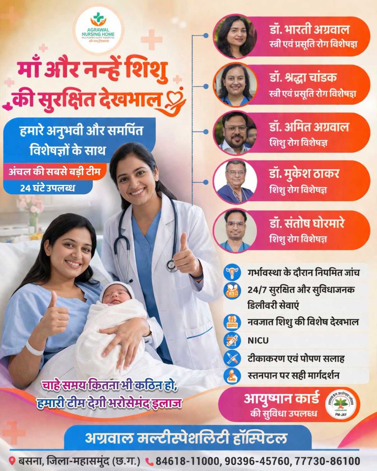 Home/छत्तीसगढ़/महासमुंद/बसना/अग्रवाल मल्टीस्पेशलिटी हॉस्पिटल: मां और नन्हे शिशु की सुरक्षित देखभाल बसना अग्रवाल मल्टीस्पेशलिटी हॉस्पिटल: मां और नन्हे शिशु की सुरक्षित देखभाल काका खबरीलालApril 7, 2026 2,102 Less than a minute Related Articles बसना:अग्रवाल मल्टीस्पेशलिटी हॉस्पिटल में अत्यंत गरीब व जरूरतमंद गर्भवती महिलाओं के लिए नि: शुल्क डिलिवरी सुविधा आज ही पंजीयन करें April 5, 2026 AD#1 Tagsअग्रवाल मल्टीस्पेशलिटी हाॅस्पिटल में जनवरी माह काका खबरीलालApril 7, 2026 2,102 Less than a minute Facebook Twitter WhatsApp Telegram Print
