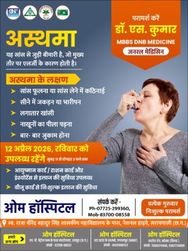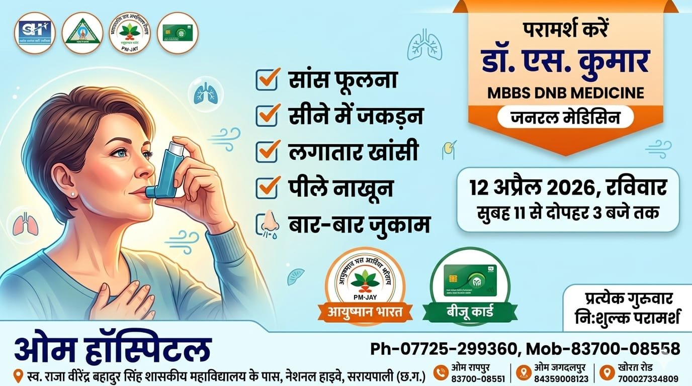 सरायपाली (छत्तीसगढ़): क्षेत्र के नागरिकों के स्वास्थ्य को ध्यान में रखते हुए ओम हॉस्पिटल द्वारा अस्थमा (दमा) के मरीजों के लिए एक विशेष परामर्श शिविर का आयोजन किया जा रहा है। यह शिविर 12 अप्रैल 2026, रविवार को आयोजित होगा, जिसमें सुप्रसिद्ध विशेषज्ञ डॉ. एस. कुमार (MBBS, DNB MEDICINE – जनरल मेडिसिन) अपनी सेवाएँ देंगे।
