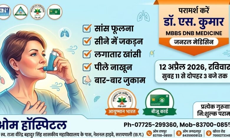सरायपाली के ओम हॉस्पिटल में 12 अप्रैल को अस्थमा शिविर का आयोजन: कोई भी सांस संबंधी समस्याओं से जूझ रहा है, तो इस शिविर का लाभ अवश्य उठाएं, अभी संपर्क करें…