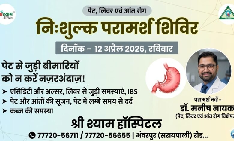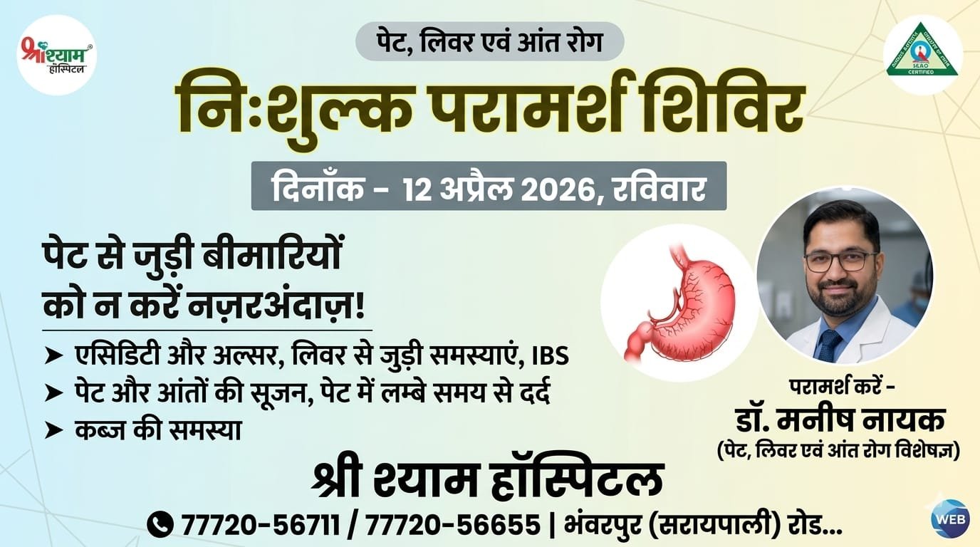 सरायपाली/भंवरपुर। क्षेत्र के नागरिकों को बेहतर स्वास्थ्य सुविधाएं प्रदान करने के उद्देश्य से भंवरपुर (सरायपाली) रोड स्थित प्रतिष्ठित श्री श्याम हॉस्पिटल भंवरपुर द्वारा एक विशाल निःशुल्क चिकित्सा परामर्श शिविर का आयोजन किया जा रहा है। यह शिविर आगामी 12 अप्रैल 2026, रविवार को आयोजित होगा।