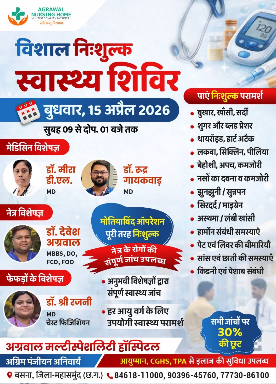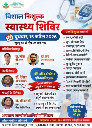 Home/बसना/अग्रवाल मल्टीस्पेशलिटी हॉस्पिटल में 15 अप्रैल को विशाल निशुल्क स्वास्थ्य शिविर का आयोजन बसना अग्रवाल मल्टीस्पेशलिटी हॉस्पिटल में 15 अप्रैल को विशाल निशुल्क स्वास्थ्य शिविर का आयोजन काका खबरीलालApril 14, 2026 2,106 Less than a minute Related Articles श्री श्याम हॉस्पिटल भंवरपुर की अनूठी पहल: बेटी के जन्म पर ऑपरेशन और इलाज बिल्कुल मुफ्त April 7, 2026 AD#1 Tagsअग्रवाल मल्टीस्पेशलिटी हाॅस्पिटल में जनवरी माह काका खबरीलालApril 14, 2026 2,106 Less than a minute Facebook Twitter WhatsApp Telegram Print