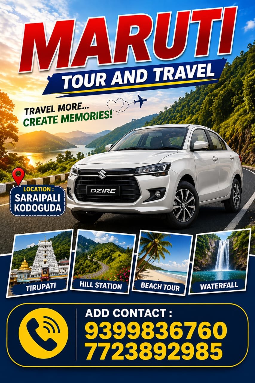 सरायपाली। अंचल में MARUTI TOUR AND TRAVEL लेकर आये हैं बेहतरीन TOUR का मौका TIRUPATI HIL STATION BEACH TOUR WATER FALL का आनंद तो देर किस बात की आज ही संपर्क करे पता: सरायपाली कोदोगुडा मोबाइल 9399836760,7723892985
