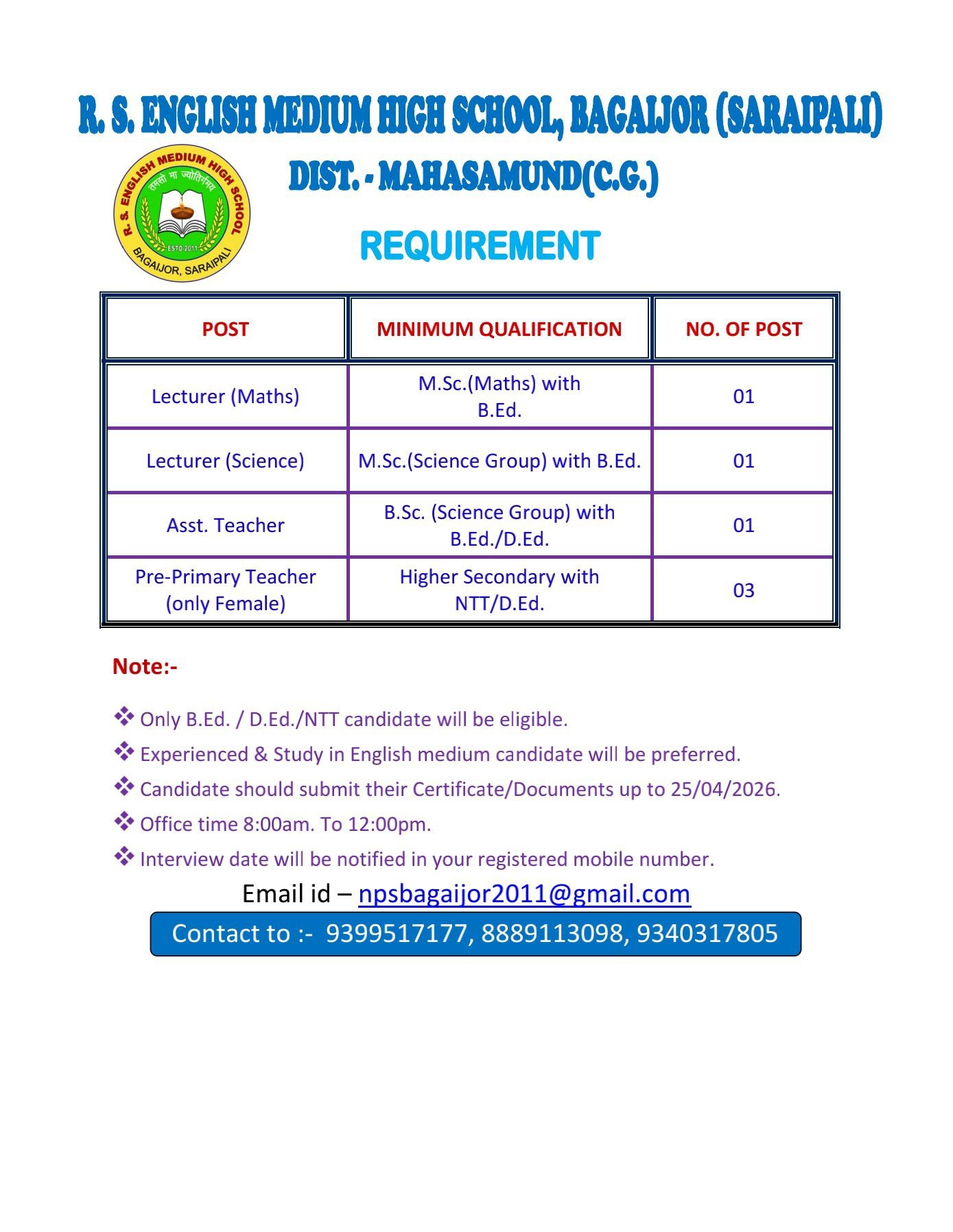 सरायपाली@ विज्ञापन। आर. एस. इंग्लिश मीडियम स्कूल बगाईजोर सरायपाली में शिक्षकों के विभिन्न पदों के लिए भर्ती निकली है। इच्छुक योग्यता धारी आवेदक 25 अप्रैल तक अपनी बायोडाटा मेल कर सकते हैं npsbagaijor2011@ gmail. Com पर मेल कर सकते हैं या आफिस समय 8 से 11 बजे तक सीधे आफिस में बायोडाटा जमा कर सकते हैं। अधिक जानकारी के लिए संपर्क करे 9399517177,8889113098,9340317805