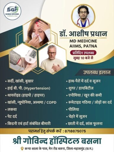 बसना (महासमुंद)। इलाके के मरीजों को अब गंभीर बीमारियों के इलाज के लिए बड़े शहरों की दौड़ नहीं लगानी होगी। नगर के प्रतिष्ठित श्री गोविन्द हॉस्पिटल बसना ने अपनी स्वास्थ्य सेवाओं में विस्तार करते हुए प्रसिद्ध चिकित्सक डॉ. आशीष प्रधान (MD Medicine, AIIMS Patna) की सेवाएं शुरू की हैं।