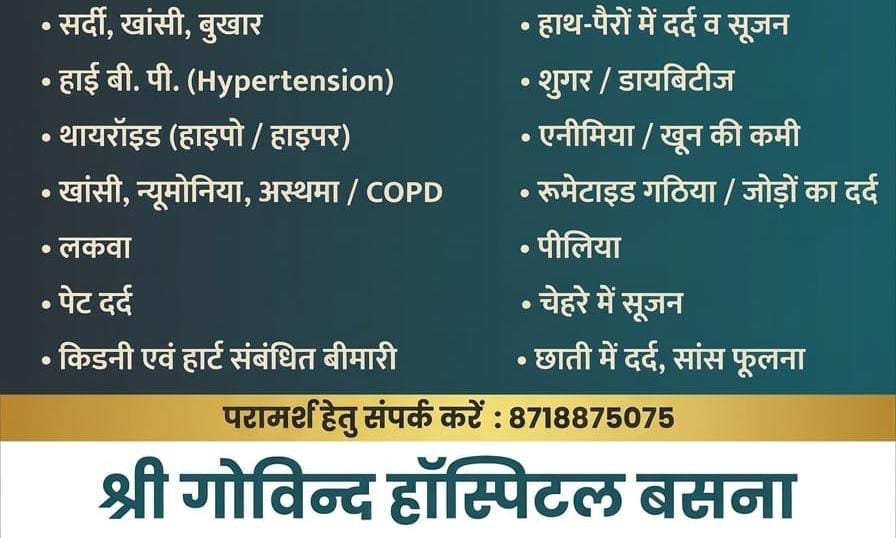 श्री गोविन्द हॉस्पिटल बसना, महासमुंद जिले के मेन रोड पर कन्या शाला के पास स्थित है। मरीज परामर्श और अपॉइंटमेंट के लिए अस्पताल के हेल्पलाइन नंबर 8718875075 पर संपर्क कर सकते हैं।