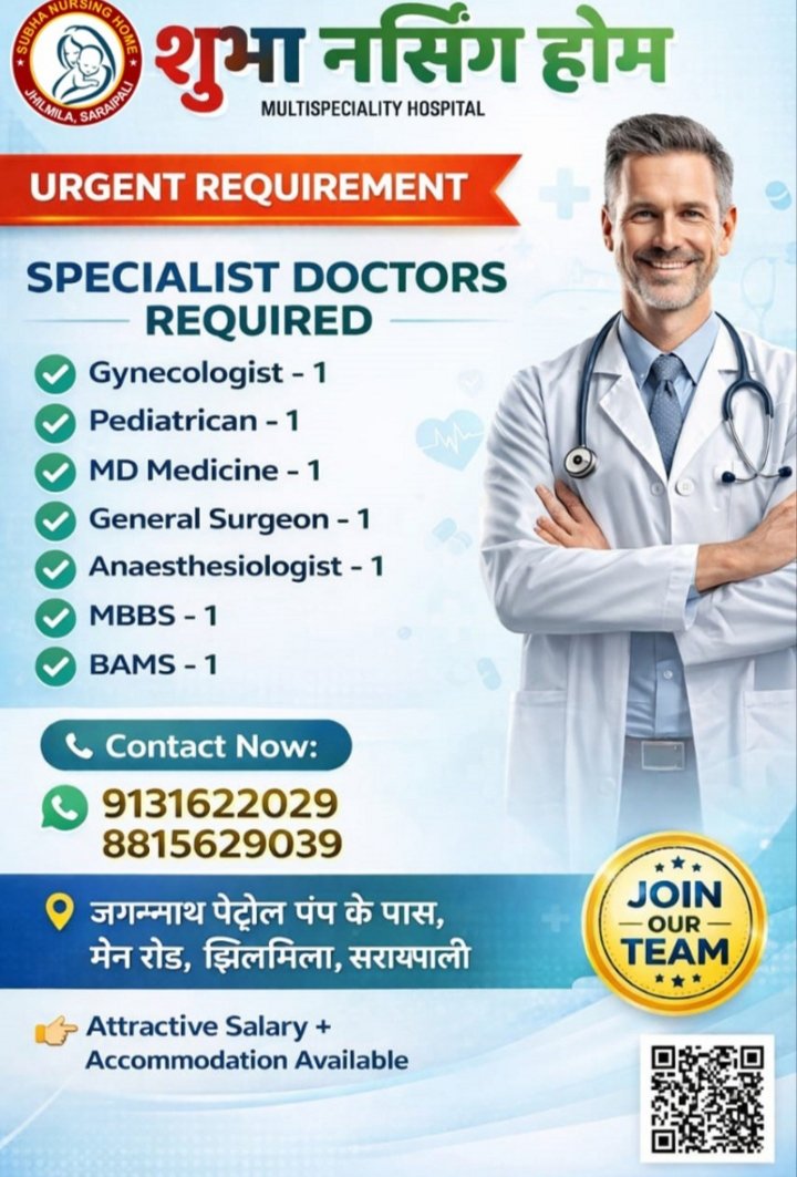 सरायपाली । शहर स्थित शुभा नर्सिंग होम में तत्काल आवश्यकता है स्पेशलिस्ट डॉक्टर की जिसकी डिटेल्स इस प्रकार से है।