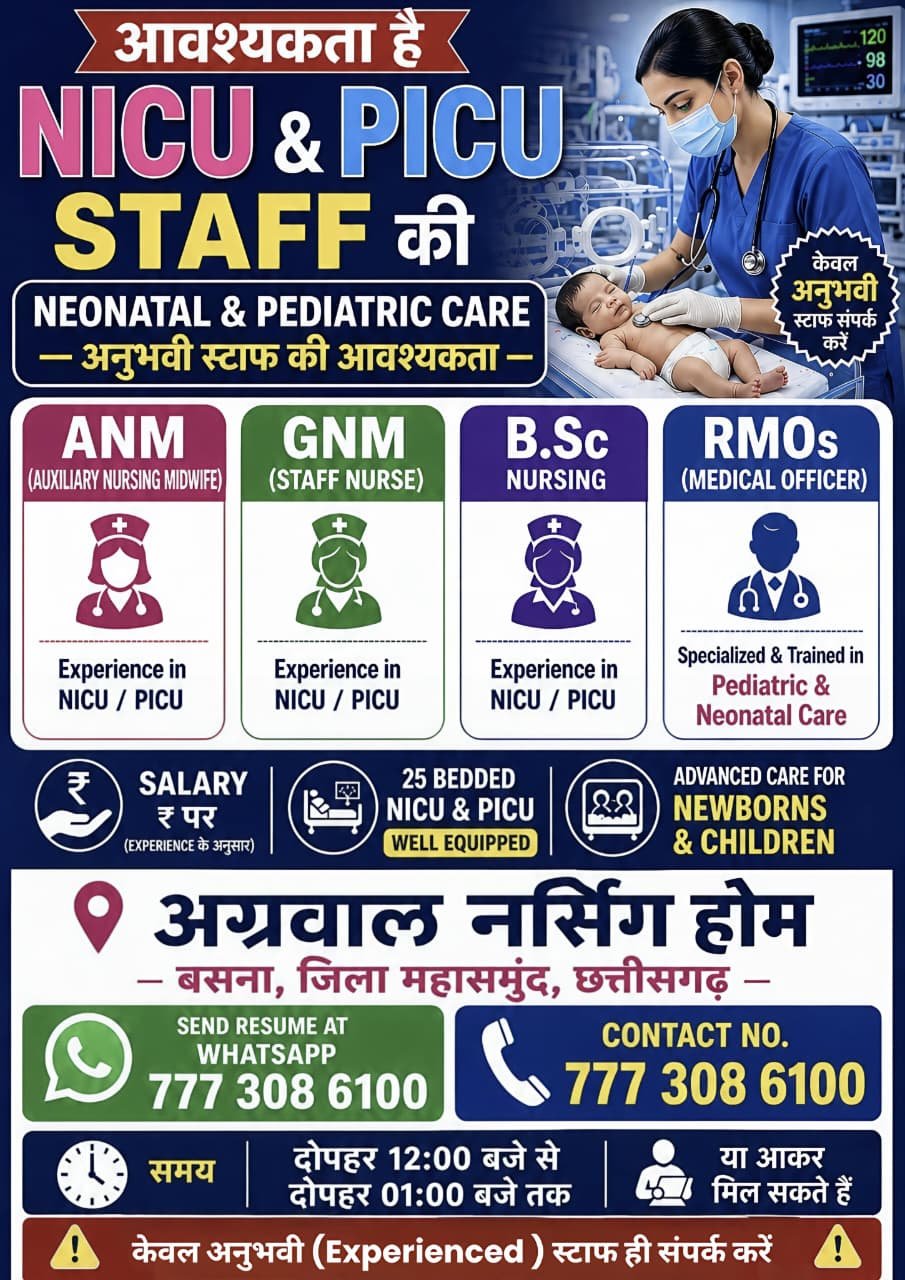 बसना। अंचल के लोगों के लिए गोल्डन चांस अग्रवाल मल्टीस्पेशलिटी हॉस्पिटल में आवश्यकता है अनुभवी NICU एंड PICU स्टाफ की देखिए पुरी डिटेल्स
