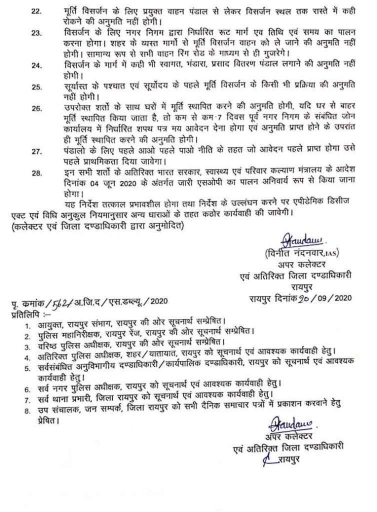 रायपुर (काकाखबरीलाल) .नोवल कोरोना वायरस के बढ़ते संकमण पर लगाम कसने के लिए प्रशासन ने दुर्गा पूजा के मद्देनजर निर्देश जारी किया है, जिसमें आकार से लेकर मूर्ति स्थापना और विसर्जन के साथ पंडाल की जगह, श्रद्धालुओं के लिए व्यवस्था के साथ अन्य संबंधित विषयों को शामिल किया गया है.रायपुर कलेक्टर की ओर से जारी निर्देश में मूर्ति की ऊंचाई एवं चौड़ाई 6×5 फिट से अधिक नहीं होने, मूर्ति स्थापना वाले पंडाल का आकार 15×15 फीट से अधिक नहीं होने, पंडाल के सामने कम से कम 3000 वर्ग फीट की खुली जगह में कोई भी सड़क अथवा गली का हिस्सा प्रभावित न होने, एक पंडाल से दूसरे पंडाल की दूरी 250 मीटर से कम नहीं होने, मंडप पंडाल के सामने दर्शकों के बैठने हेतु पृथक से पंडाल नहीं होने की बात कही गई है.