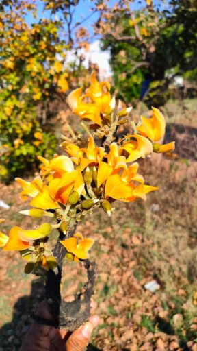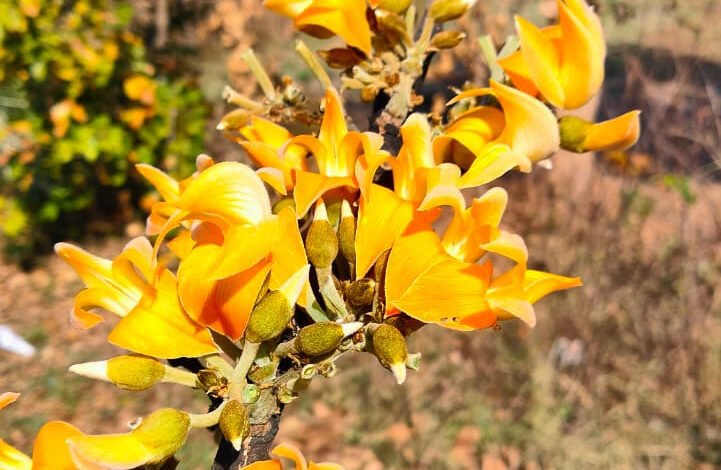 Rare Yellow Palash Flower आमतौर पर पलाश के फूल लाल रंग के होते हैं मगर उनके हाथों में पलाश के जो फूल थे वे पीले रंग के थे। भंवरपूर-सागरपाली मार्ग किनारे खिले पीले रंग के पलाश पर अनायास ही नजर पड़ जाता है। वैसे तो पलाश के फूल अपने चटख लाल रंग के कारण जाना जाता है जो ऋतुराज बसंत के आगमन की सूचना देता है।