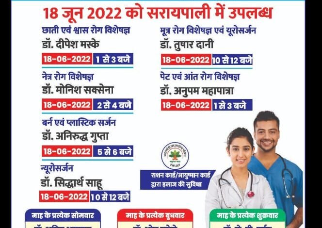 अग्रवाल डेंटल पालिक्लिनिक सरायपाली आईडीबीआई बैंक के बाजु में स्थित  क्लिनिक में 18  जून को उपलब्ध रहेंगे छाती एवं श्वास रोग विशेषज्ञ डाक्टर दीपक मस्के दोपहर 1 बजे से 3 बजे तक डाक्टर तुषार दानी मुत्र रोग विशेषज्ञ 10 बजे से 12 बजे तक डाक्टर अनुपम महापात्रा  पेट व आंत रोग विशेषज्ञ  1 बजे से 3 बजे तक डाक्टर सिध्दार्थ साहु  न्युरो सर्जन 10 से 12 बजे तक डाक्टर अनिरुद्ध गुप्ता प्लास्टिक सर्जन 5 से 6 बजे तक डाक्टर मोनिष सक्सेना नेत्र रोग विशेषज्ञ 2 से 4 बजे तक  पंजीयन के लिए संपर्क करे 7773086100, 8461811000