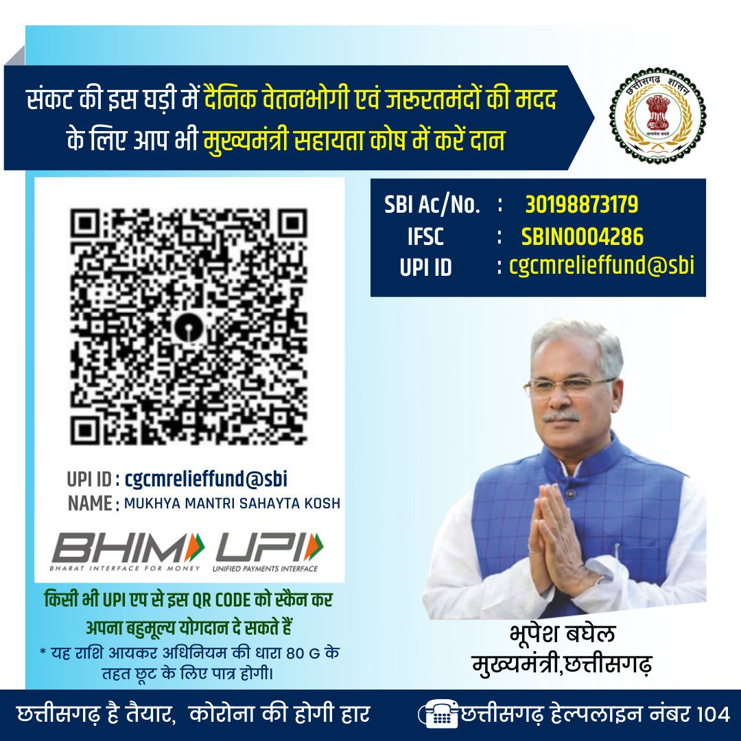 (रायपुर) . मुख्यमंत्री भूपेश बघेल ने दैनिक वेतनभोगियों और जरूरतमंदों की मदद के लिए मुख्यमंत्री सहायता कोष में दान की अपील की है। उन्होंने संकट की इस घड़ी में ज्यादा से ज्यादा लोगों को मुख्यमंत्री सहायता कोष में दान देकर जरूरतमंदों की सहायता में सहभागी बनने कहा है। मुख्यमंत्री श्री बघेल ने मुख्यमंत्री सहायता कोष का खाता नम्बर, आईएफएससी कोड और यूपीआई आईडी की जानकारी देते हुए कोष में राशि जमा करने का आग्रह किया है। मुख्यमंत्री सहायता कोष में भारतीय स्टेट बैंक के खाता क्रमांक 30198873179, आईएफएससी कोड SBIN0004286 और यूपीआई आईडी cgcmrelieffund@sbi के माध्यम से राशि जमा की जा सकती है