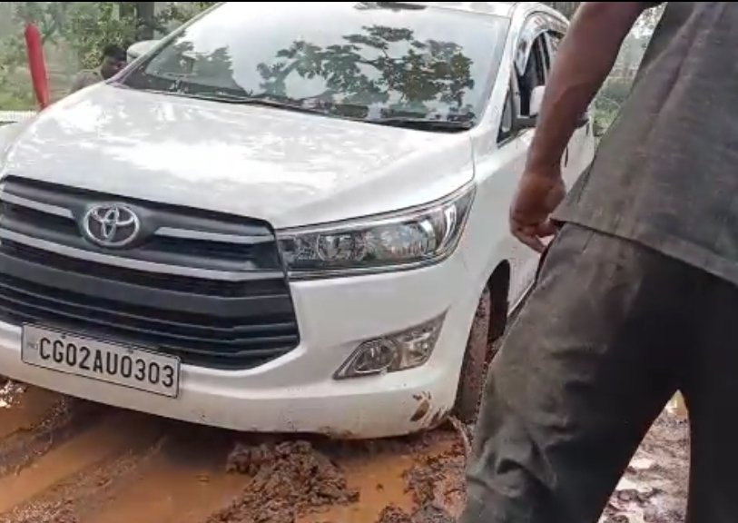 सड़क का निरीक्षण करने निकले संसदीय सचिव की गाड़ी फँसी… ट्रेक्टर से हुआ टोचन