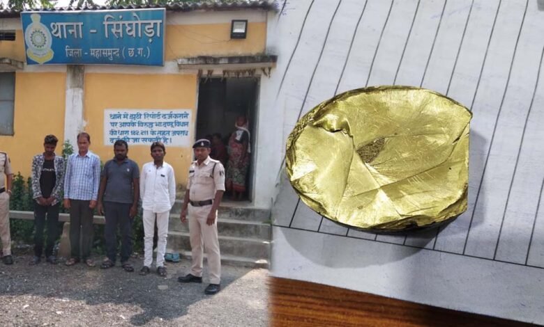 जिसके तहत सायबर सेल तथा थाना सिंघोडा की पुलिस के द्वारा संयुक्त टीम तैयार कर प्रार्थी के पास रखे काले पीले रंग के चैकोना सोने जैसा धातु वजनी 90 ग्राम जप्त कर एवं आरोपी (01) दयानिधी यादव पिता पूरण यादव उम्र 36 वर्ष सा. बोडेसरा थाना सरायपाली को ग्राम बोडेसरा से गिरफ्तार कर उसके कब्जे से एक काले पीले रंग का गोलाकार सोने जैसा धातू टुकडा जिसका वजन करीब 1.50 किलो ग्राम तथा एक नग मोटर सायकल व 01 नग मोबाईल जप्त (02) आरोपी प्रेमदास वैष्णव पिता गोपाल दास वैष्णव उम्र 50 वर्ष सा. बोडेसरा थाना सरायपाली को ग्राम बोडेसरा से गिरफ्तार किया गया (03) आरोपी श्यामसुन्दर कुम्हार पिता पतिराम कुम्हार उम्र 33 वर्ष सा. बान्दुपाली चैकी बलौदा थाना सरायपाली को ग्राम बान्दुपाली से गिरफ्तार कर उसके कब्जे से 01 मोबाईल जप्त किया गया। (04) आरोपी तरूण दीप चैहान पिता भागीरथी चैहान उम्र 26 वर्ष सा. ग्राम केरमेली थाना डोगरीपाली सारंगढ जिला रायगढ को ग्राम केरमेली थाना डोगरीपाली गिरफ्तार कर उसके कब्जे से 01 नग मोटर सायकल जप्त किया गया है।
