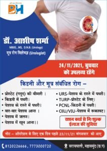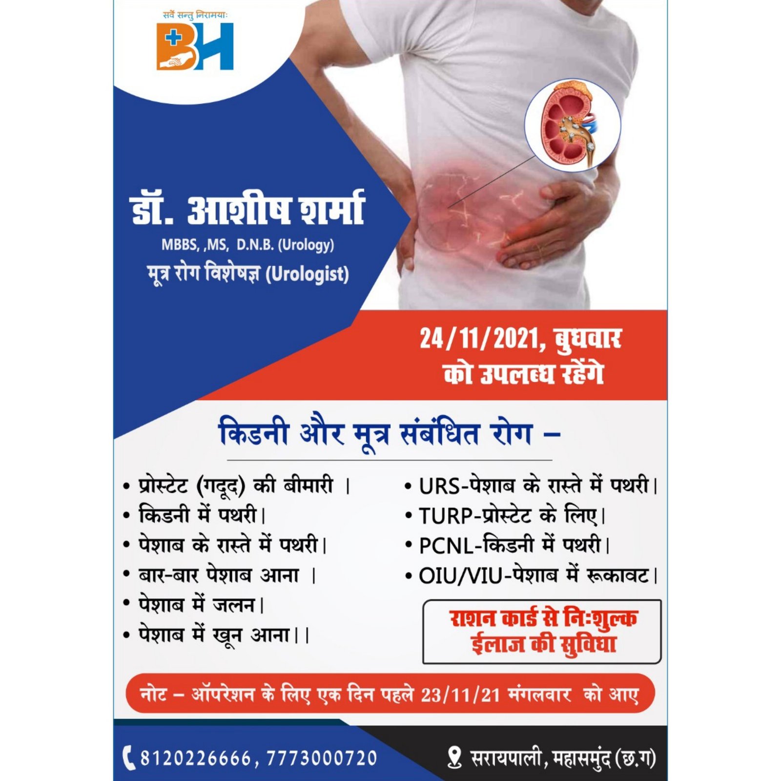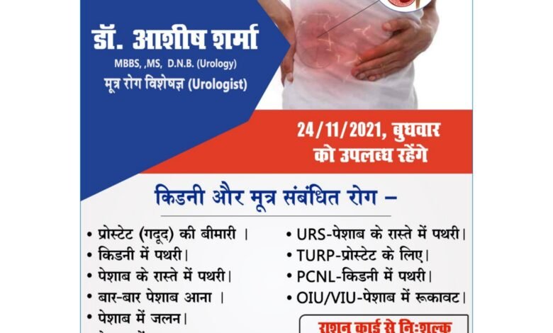 किडनी एंव मूत्र से सम्बंधित विभिन्न प्रकार के रोग जिसमें प्रोस्टेड (गदूद) की बीमारी, किडनी में पथरी, पेशाब के रास्ते मे पथरी, बार – बार पेशाब आना, पेशाब में जलन, पेशाब में खून आना, यूआरएस – पेशाब के रास्ते मे पथरी, TURP – प्रोस्टेड के लिए, PCNL – किडनी में पथरी, OIU/VIU – पेशाब में रुकावट आदि रोगों का राशन कार्ड से निःशुल्क इलाज की सुविधा भारती हॉस्पिटल में मूत्र रोग विशेषज्ञ डॉक्टर आशीष शर्मा के द्वारा इलाज किया जाएगा। अधिक जानकारी के लिए 8120226666 या 7773000720 भारती हॉस्पिटल सरायपाली महासमुंद से संपर्क कर सकते हैं।