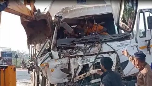 यात्री बस और ट्रेलर में हुई जबरदस्त भिडंत में ट्रेलर ड्राइवर फंसा केबिन में…..