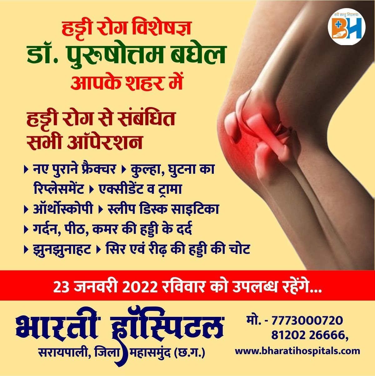 स्वास्थ्य सेवाएं@सरायपाली। भारती हॉस्पिटल सरायपाली में हड्डी रोग विशेषज्ञ उपलब्ध हैं। हड्डी रोग विशेषज्ञ डॉ पुरुषोत्तम बघेल अपनी सेवाएं 23 जनवरी 2022 दिन रविवार को हड्डी रोग से संबंधित सारी समस्याओं के समाधान के लिए उपलब्ध रहेंगे।