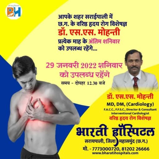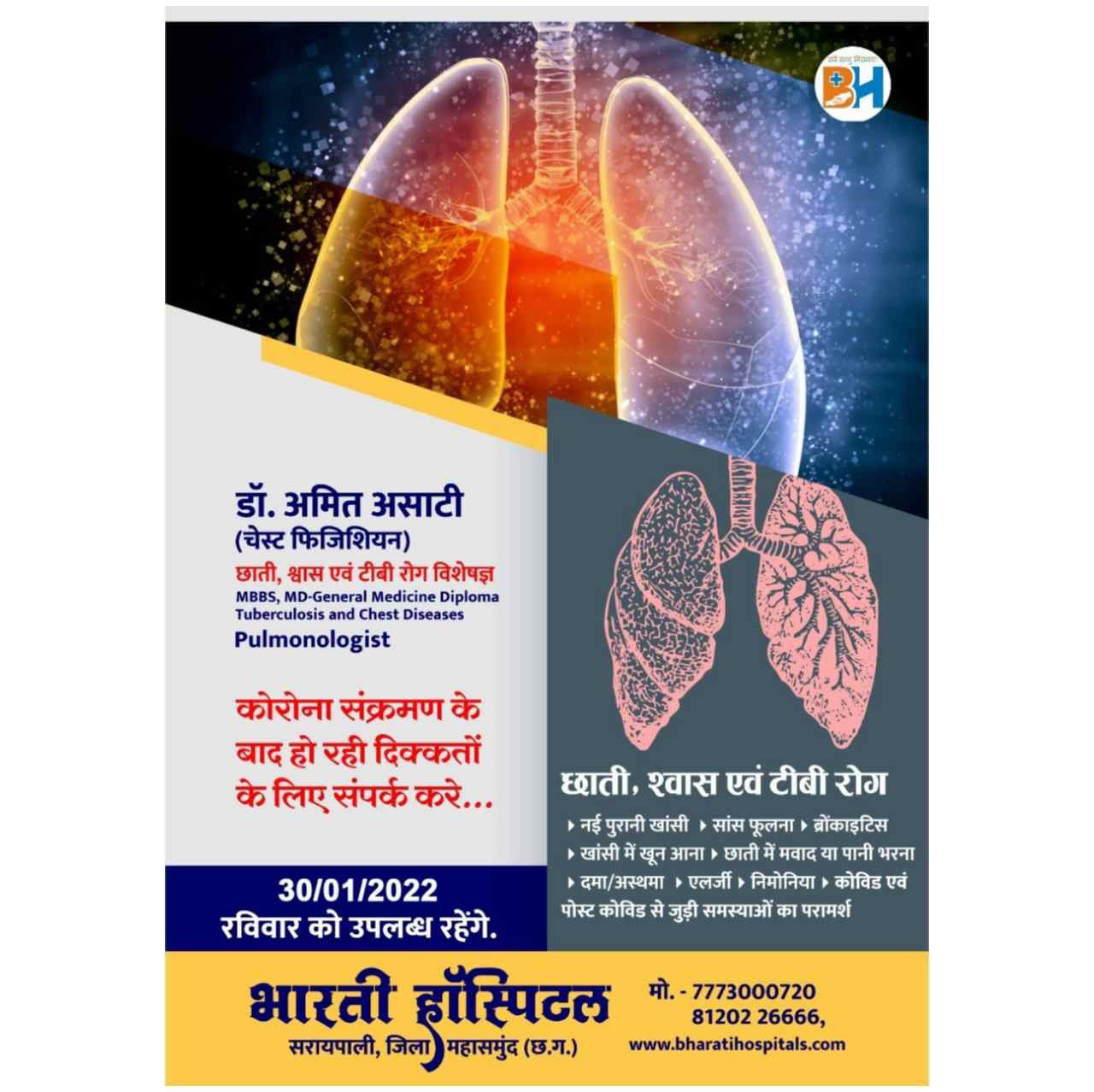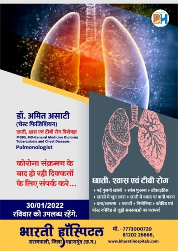 सरायपाली@काका खबरीलाल। कल दिनांक 29 जनवरी दिन शनिवार को भारती हॉस्पिटल में कोरोना संक्रमण के बाद होने वाली दिक्कतों का इलाज के लिए प्रसिद्ध चेस्ट फिजिसियन डाक्टर अमित असाटी उपलब्ध रहेंगे।