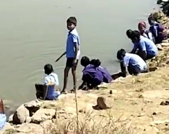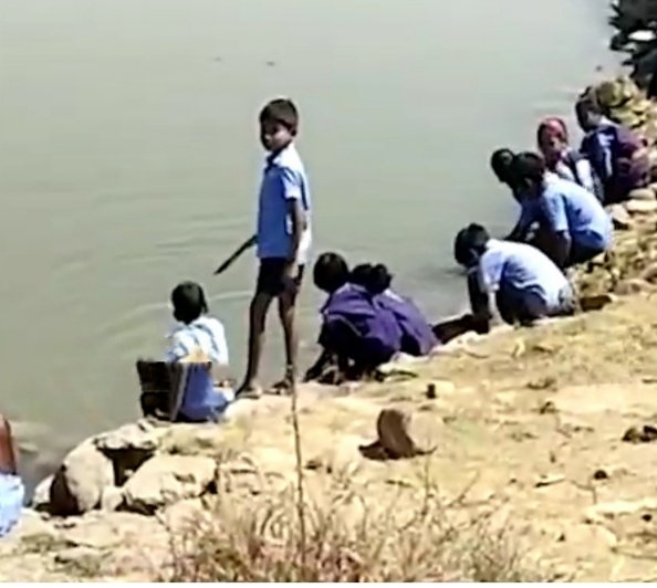 बसना: स्कूल के बच्चे मध्यान्ह भोजन करने के बाद बांध में थाली धोने और पानी पीने को मजबूर