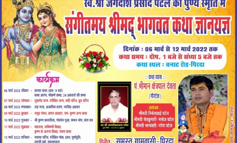 पिरदा : 6 मार्च से 12 संगीतमय श्रीमद् भागवत कथा ज्ञान यज्ञ का आयोजन