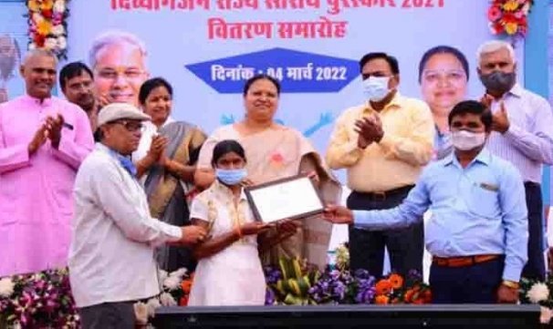 समाज कल्याण विभाग द्वारा माना कैम्प स्थित संचालनालय परिसर में आयोजित समारोह में राज्य सभा सांसद छाया वर्मा, छत्तीसगढ़ योग आयोग के अध्यक्ष ज्ञानेश शर्मा, विभिन्न जिलों से आए दिव्यांगजन और दिव्यांगजनों के कल्याण के लिए कार्य करने वाली संस्थाओं के पदाधिकारी शामिल हुए। समारोह में अतिथियों ने विभागीय मेन्युअल पुस्तिका, शराब व्यसन मुक्ति पुस्तिका और ब्रेल कैलेण्डर का भी विमोचन किया। इस दौरान सर्वोत्तम स्वैच्छिक संस्था के लिए दृष्टि बाधित श्रेणी में महासमुंद जिले की फॉर्चून फाउण्डेशन समाज सेवी संस्था़ और श्रवण बाधित संवर्ग के लिए जांजगीर.चांपा जिले के प्रेमधारा चेरिटेबल सोसायटी नवजीवन मूकबधिर विद्यालय और सर्वोत्तम दृष्टि बाधित नियोक्ता की श्रेणी में बालोद जिले के खेमराज जनकल्याण संस्था समिति को दिव्यांगजन राज्य स्तरीय पुरस्कार से सम्मानित किया गया।