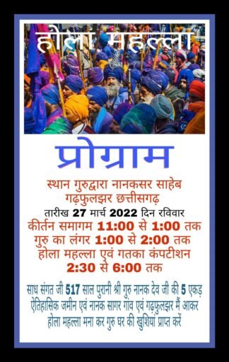 नानकसागर गुरुद्वारा निर्माण समिति के अध्यक्ष महेंद्र सिंह छाबड़ा एवम रिंकू ओबेरॉय ने इस सम्बंध में जानकरी देते हुए बताया कि नानक सागर गुरुद्वारा गढ़फुलझर में आयोजित एक बैठक में निर्णय लिया गया कि आगामी 27 मार्च को यहां होला मोहल्ला का कार्यक्रम आयोजित किया जाएगा।इस दिन गुरु की भूमि पर सुबह 11 से 1 बजे तक कीर्तन समागम ,दोपहर 1 से 2 बजे तक लंगर , इसके बाद ढाई से शाम 6 बजे के बीच होला मोहल्ला,फूलों की वर्षा के साथ प्रदेश के विभिन्न क्षेत्रों से पहुचने वाली गतका टीम के बीच कॉम्पिटिशन आयोजित किया गया।उक्त कार्यक्रम में जिले के साथ पूरे देश के श्रद्धालुओ के पहुचने की संभावना है।बैठक में मुख्यतः रिंकू ओबेरॉय, बाबा बुड्ढा साहिब गुरुद्वारा के प्रधान,हरिकिशन सिंह राजपूत, गुरुद्वारा श्री नानकसर साहिब गुरुद्वारा के प्रधान हरजिंदर सिंह हरजु महिपाल सिह,जरनेट सिंह,जसकल सिंह बलबिर सिंह