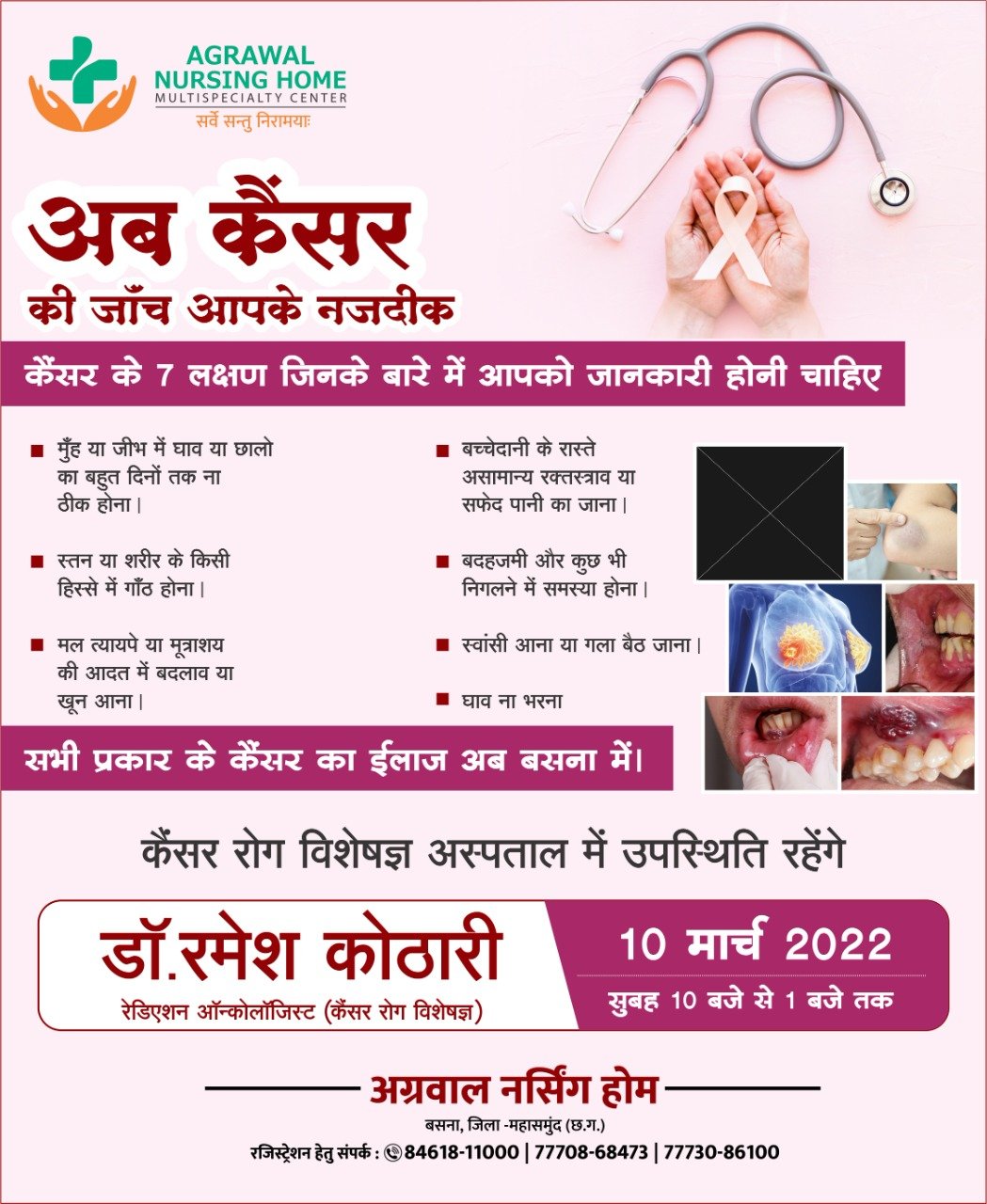 अब कैंसर के इलाज आपकी नजदीकी अग्रवाल नर्सिंग होम बसना में 10 मार्च को सुबह 10:00 बजे से 1:00 बजे तक उपलब्ध रहेंगे कैंसर रोग विशेषज्ञ डॉ रमेश कोठारी कैंसर से संबंधित लक्षण जैसे मुंह या जीभ में घाव , मुंह के जीभ में घाव बहुत दिनों तक ठीक ना होगा, बच्चेदानी के रास्ते असमान रक्तस्राव, सफेद पानी आना घाव ना भरना ,बदहजमी खांसी आना, गला बैठ जाना ,स्तन या शरीर के किसी भी हिस्से में गांठ होना , सभी प्रकार के कैंसर के इलाज अग्रवाल नर्सिंग होम बसना में पंजीयन हेतु संपर्क करें 8461811000, 7773086100
