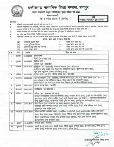 छत्तीसगढ़ माध्यमिक शिक्षा मंडल ने 10वीं—12वीं की परीक्षा के लिए टाइम टेबल जारी कर दिया है। 1 और 2 मार्च से परीक्षाएं शुरू होगी। 12वीं की परीक्षा 1 मार्च से और 10वीं की परीक्षा 2 मार्च से शुरू होगी।