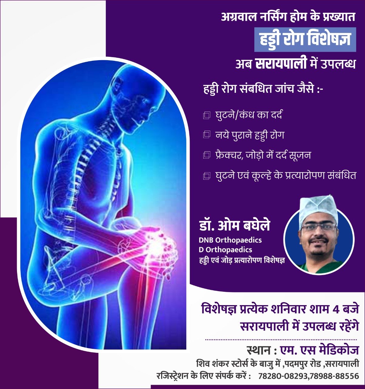 अग्रवाल नर्सिंग होम के प्रख्यात हड्डी रोग विशेषज्ञ डॉक्टर ओम बघेल अब आपके शहर सरायपाली में हड्डी रोग से संबंधित समस्याएं जैसे घुटने का दर्द कंधे का दर्द नए पुराने हड्डी रोग पिक्चर जोड़ों में दर्द सुजन जोड़ एवं घुटने में प्रत्यारोपण आदि समस्याओं से संबंधित परामर्श हेतु प्रत्येक शनिवार शाम 4:00 बजे एमएस मेडिकोज शिव शंकर स्टोर के बाजू में पदमपुर रोड सरायपाली में उपलब्ध रहेंगे रजिस्ट्रेशन हेतु संपर्क करें। 7828008293, 7898888556.