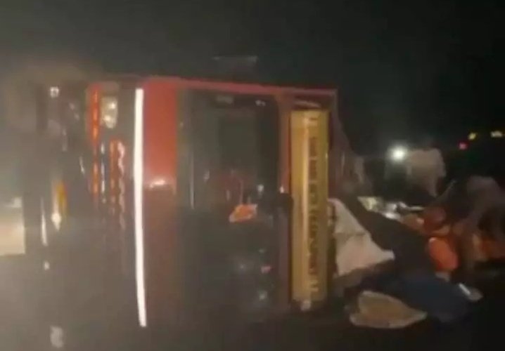 पोहा से लदा ट्रक अनियंत्रित होकर पलटा ….
