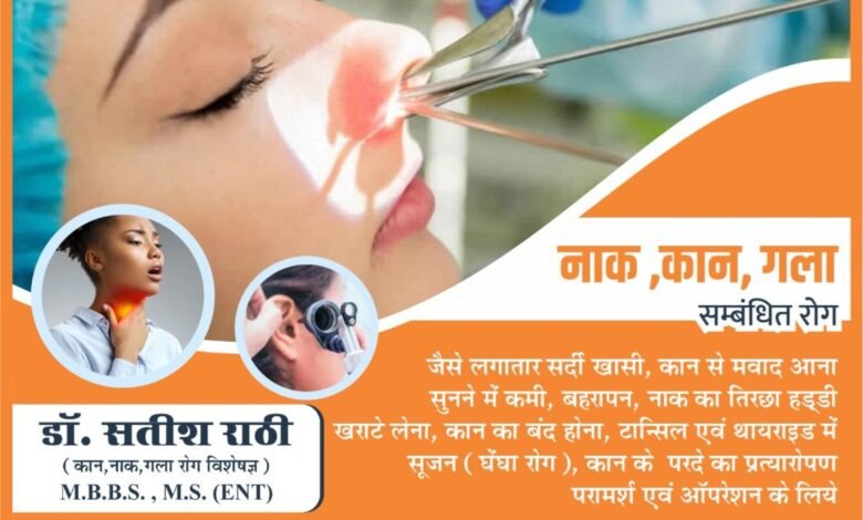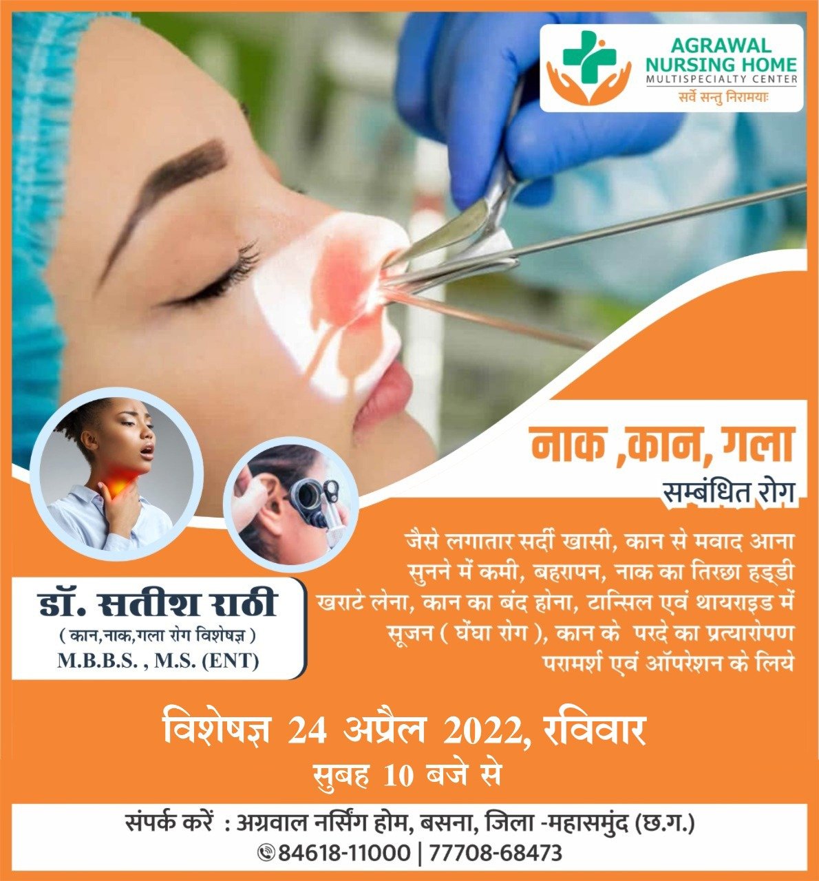 अग्रवाल नर्सिंग होम बसना में 24 अप्रैल को उपलब्ध रहेंगे नाक कान एवं गला रोग विशेषज्ञ डॉ. सतीश राठी