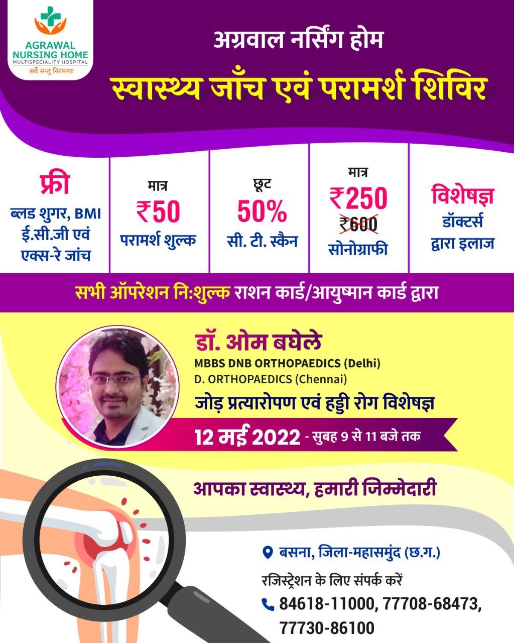 अग्रवाल नर्सिंग होम बसना में 12 मई को स्वास्थ्य जांच और परामर्श शिविर का आयोजन नि:शुल्क ब्लड शुगर BMI ई सीजी एक्सरे जांच मात्र 50 रुपये परामर्श शुल्क 50 प्रतिशत सीटी स्कैन छुट 250 रुपये सोनोग्राफी अधिक जानकारी व पंजीयन के लिए संपर्क करें अग्रवाल नर्सिंग होम बसना 7773086100, 8461811000