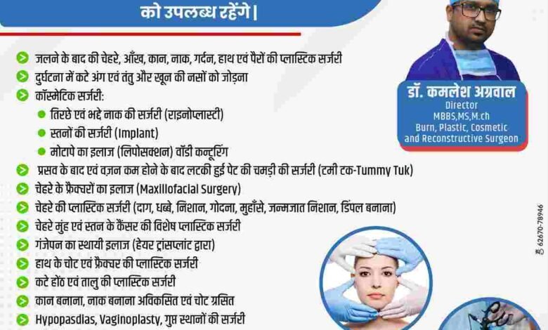सरायपाली(काकाखबरीलाल)। 50 बिस्तरों का सुपर स्पेशलिटी सेंटर ओम हॉस्पिटल सरायपाली में प्रत्येक माह के तीसरे रविवार को छत्तीसगढ़ के प्रसिद्ध बर्न एवं प्लास्टिक सर्जन डॉक्टर कमलेश अग्रवाल उपलब्ध रहेंगे जहां वे सम्बंधित मरीज से रूबरू होंगे और कई बीमारियों के बेहतर इलाज करेंगे.