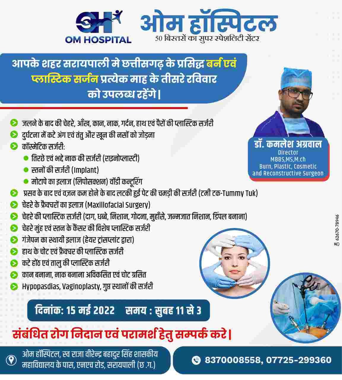 ओम हॉस्पिटल सरायपाली में प्रत्येक माह के तीसरे रविवार को मिलेंगे बर्न एवं प्लास्टिक सर्जन डॉक्टर