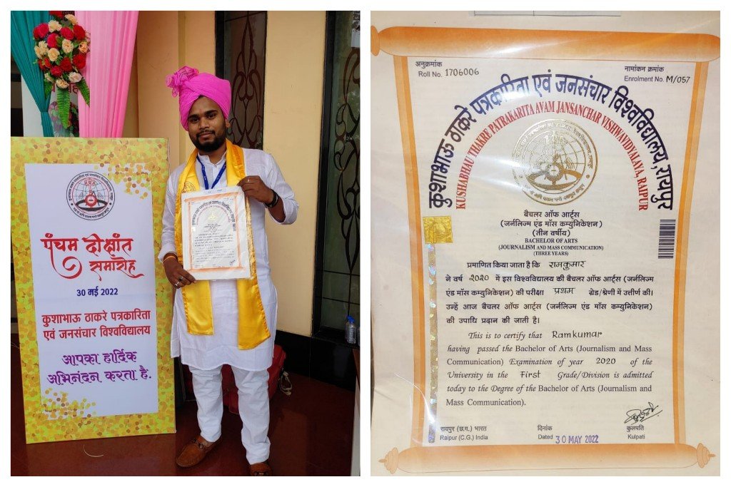बसना (काकाखबरीलाल) . छत्तीसगढ़ के एक मात्र पत्रकारिता यूनिवर्सिटी कुशाभाऊ ठाकरे पत्रकारिता एवं जनसंचार विश्वविद्यालय का पांचवा दीक्षांत समारोह आज पं. दीनदयाल उपाध्याय ऑडिटोरियम में संपन्न हुआ, जिसमें बसना क्षेत्र के रामकुमार नायक को पत्रकारिता में बैचलर ऑफ जर्नलिज्म एंड मास कम्युनिकेशन में उपाधि प्रदान की गई.